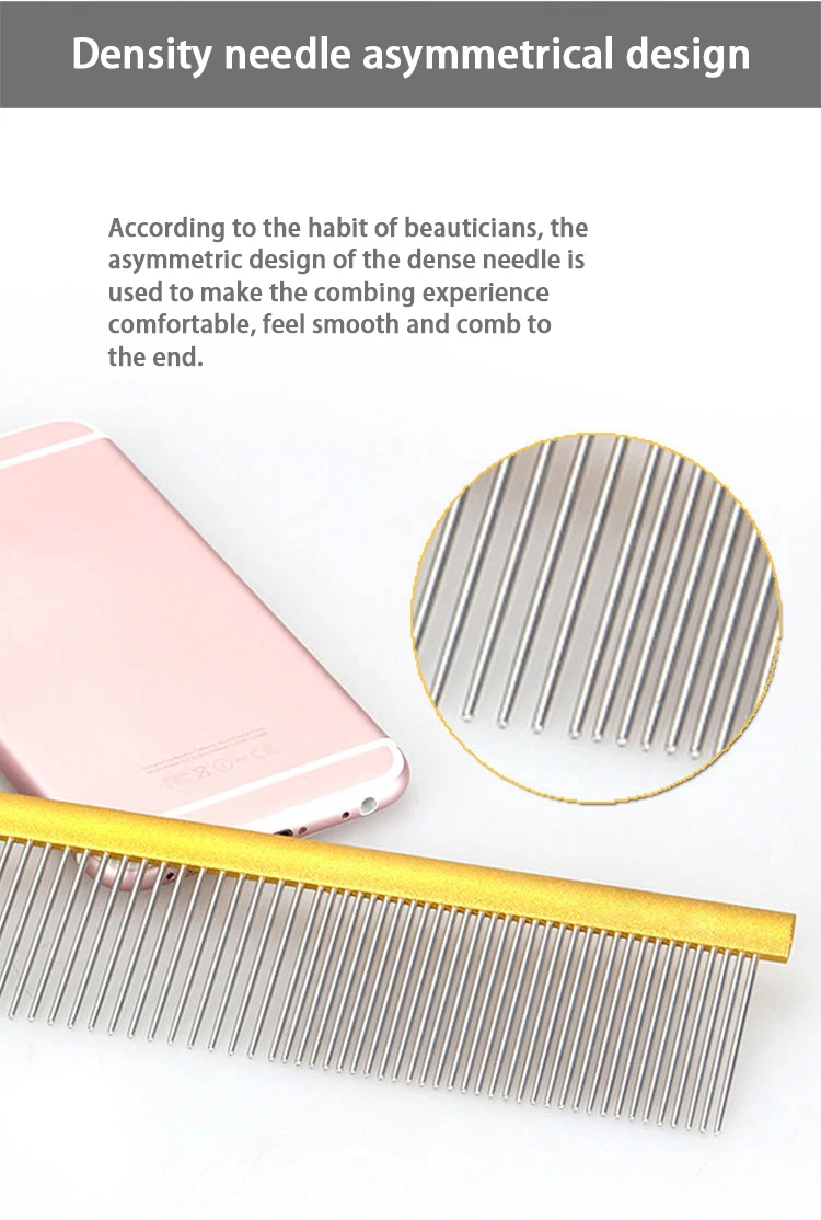 【Double-Sided Grooming.70%-80% Efficient Removing Tangles,Knots and Brushing Matted Fur.】>>Coarse Comb wide Tooth: our metal dogs and cats comb can be used for large areas grooming or brushing for tangled hair combing.The back, the tail, the limbs. Finer Comb long Tooth: Perfect for detailing and deshedding small areas around the face,make it look smoother and cleaner.It's Professional pet comb with fine tooth.